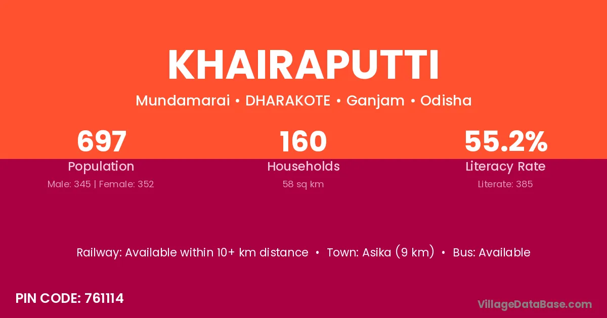 Khairaputti village has a total population of 697 people, of which 345 are males and 352 are females.