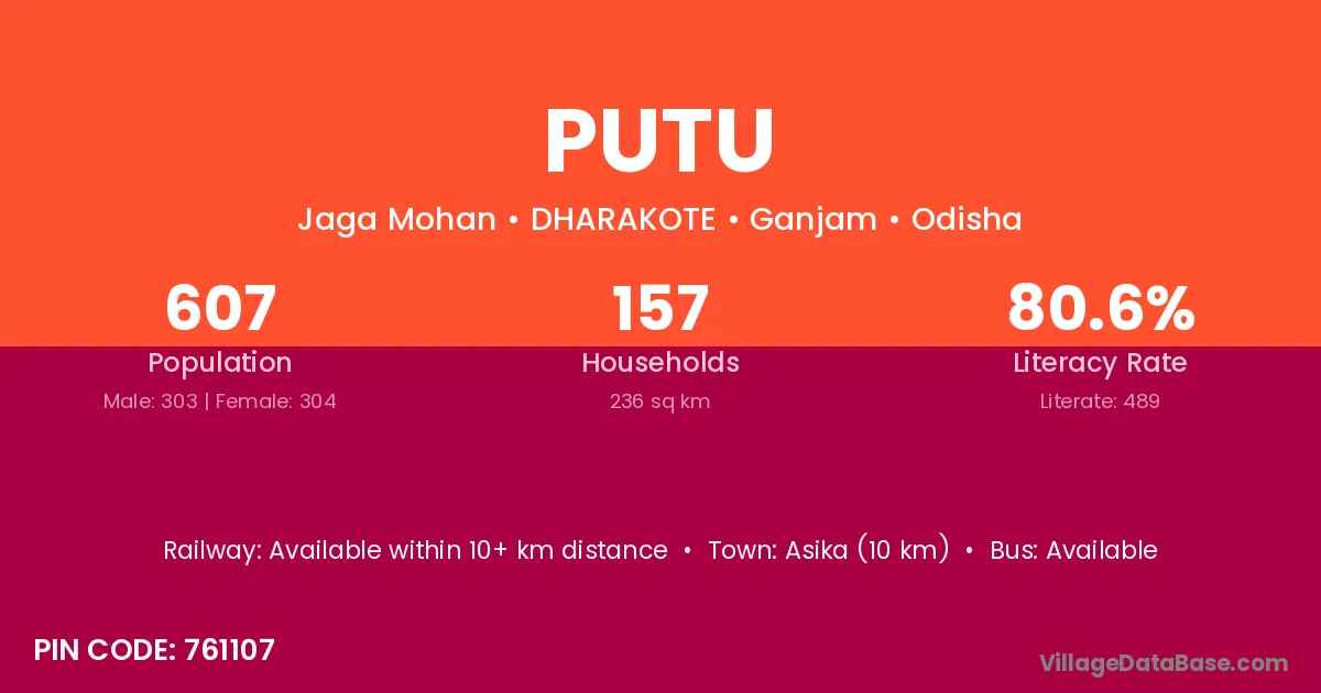 Asika (10 km) is the nearest town to Putu village for major economic activities and is located approximately 10 km away.