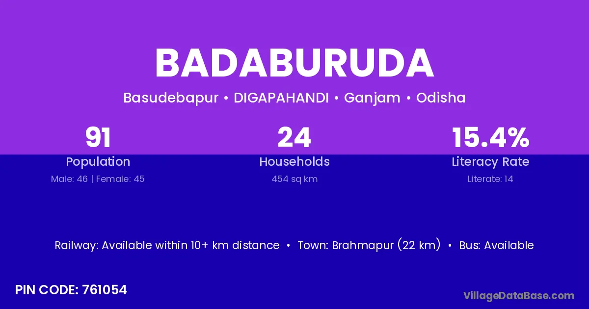 Brahmapur (22 km) is the nearest town to Badaburuda village for major economic activities and is located approximately 22 km away.