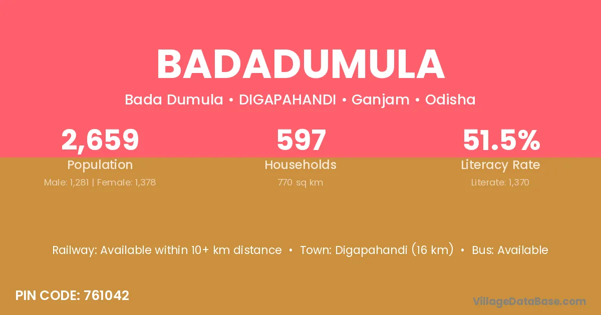 Digapahandi (16 km) is the nearest town to Badadumula village for major economic activities and is located approximately 16 km away.