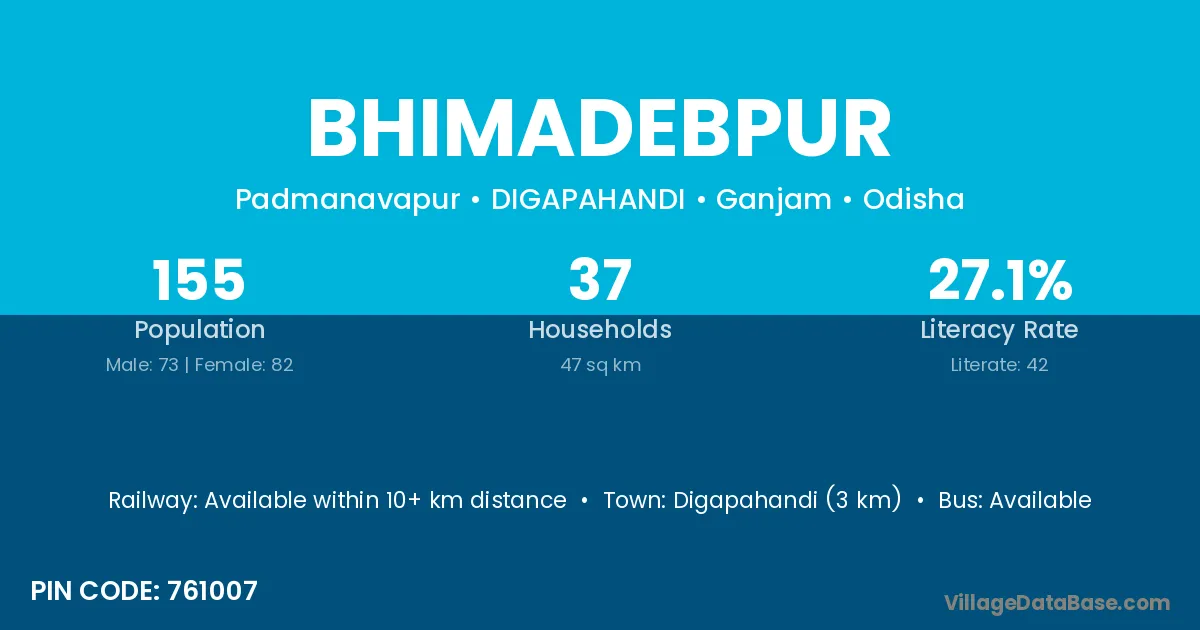 Digapahandi (3 km) is the nearest town to Bhimadebpur village for major economic activities and is located approximately 3 km away.