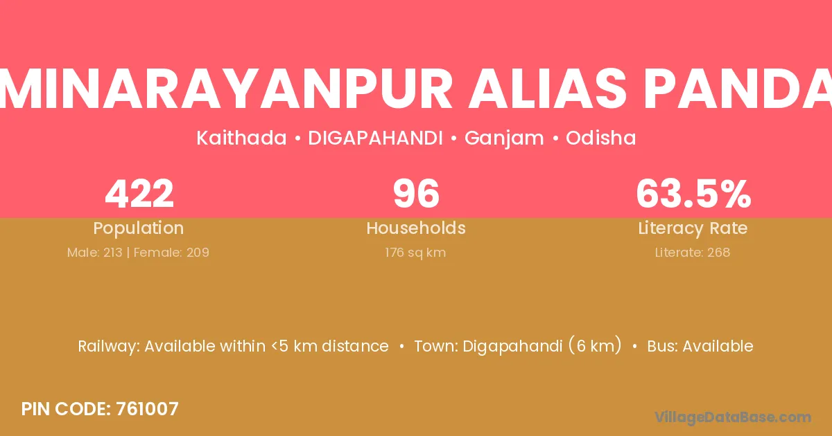 Biralaxminarayanpur Alias Pandarapada village has a total population of 422 people, of which 213 are males and 209 are females.