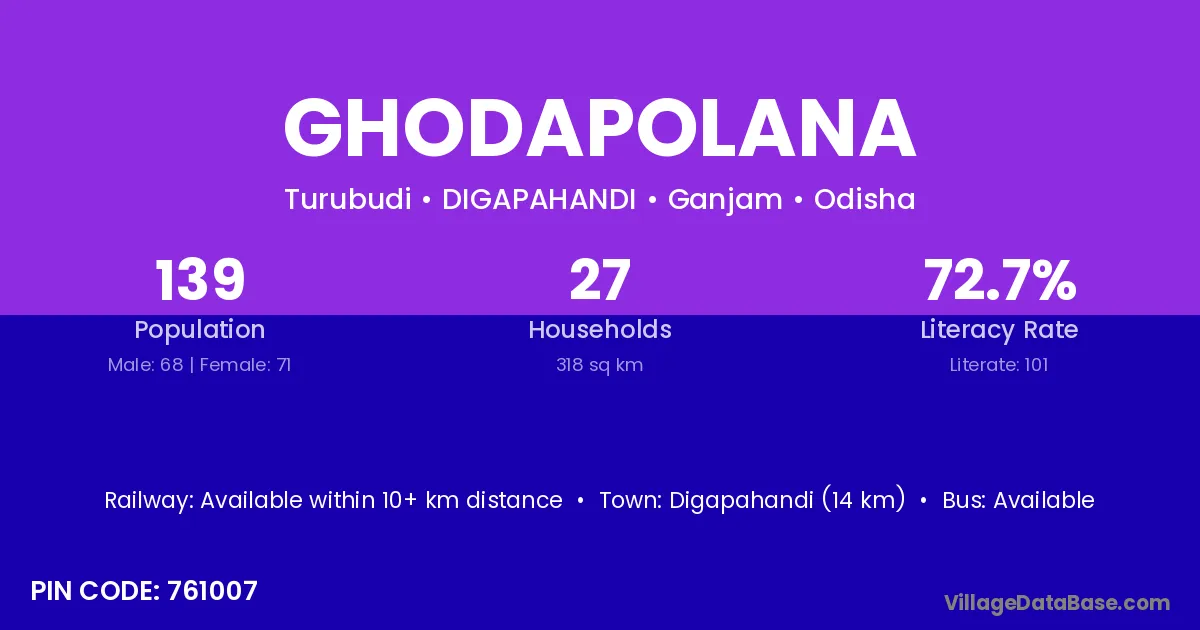 Digapahandi (14 km) is the nearest town to Ghodapolana village for major economic activities and is located approximately 14 km away.