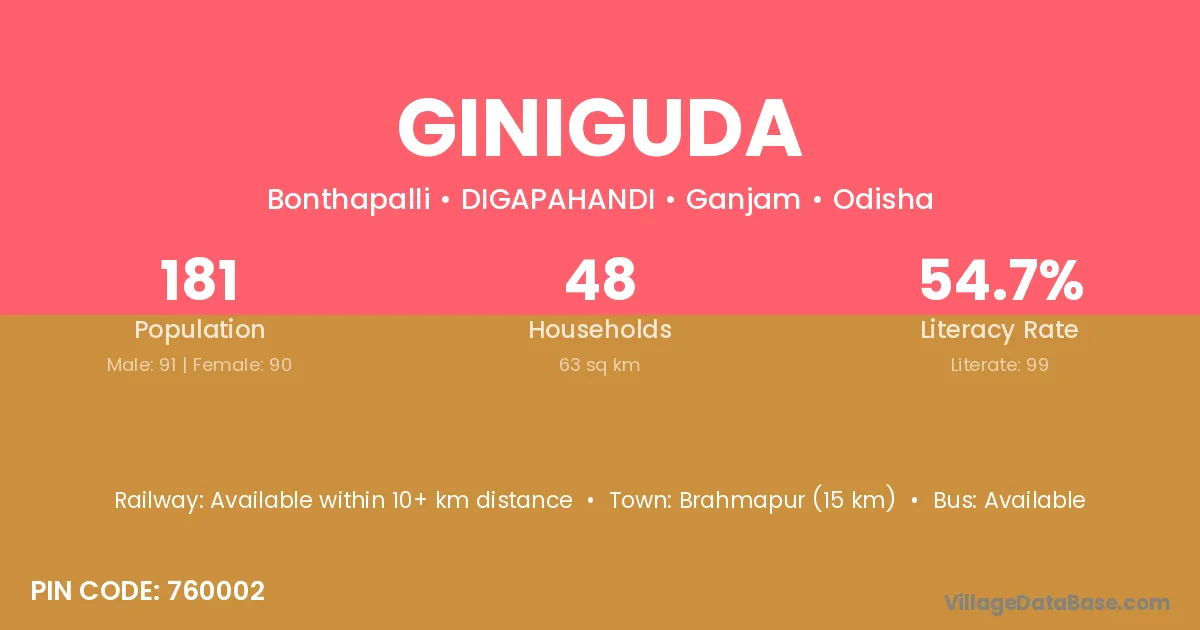 Brahmapur (15 km) is the nearest town to Giniguda village for major economic activities and is located approximately 15 km away.