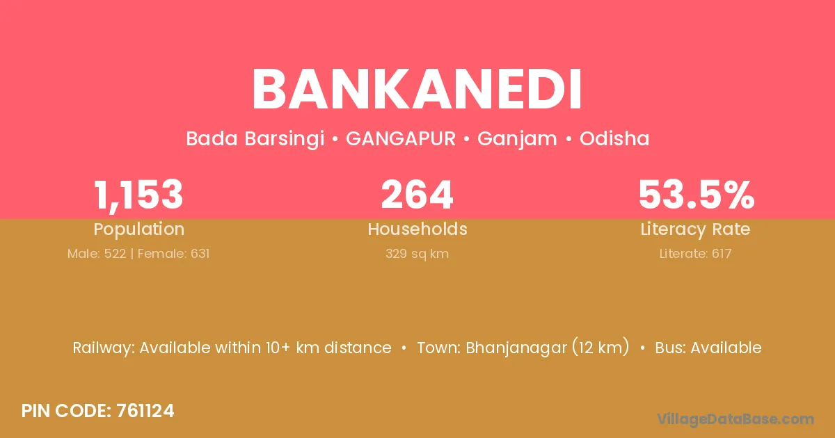 Bankanedi village has a total population of 1,153 people, of which 522 are males and 631 are females.