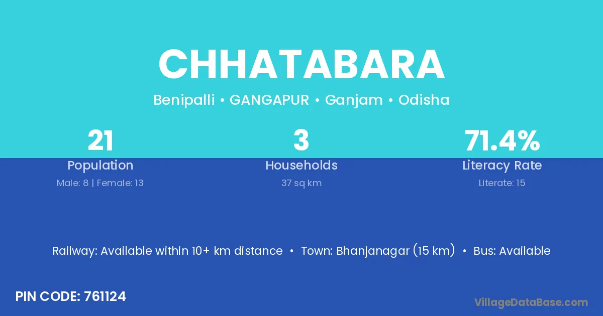 Chhatabara village has a total population of 21 people, of which 8 are males and 13 are females.