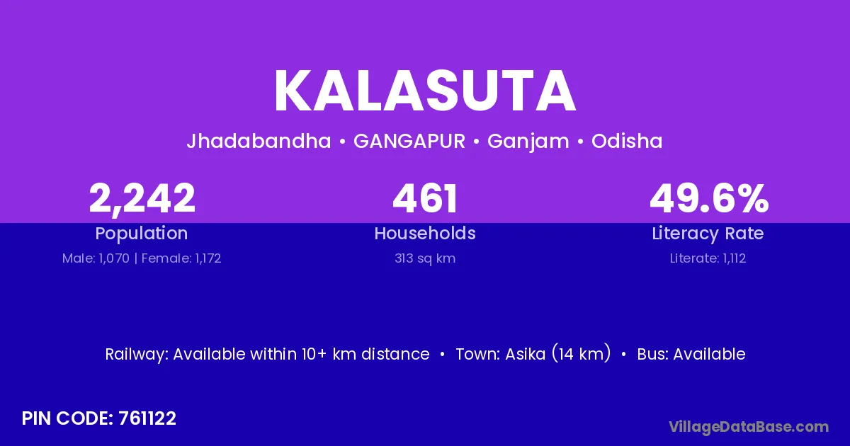 Asika (14 km) is the nearest town to Kalasuta village for major economic activities and is located approximately 14 km away.