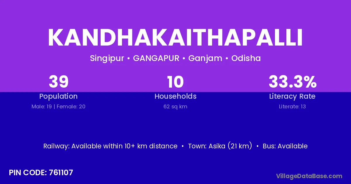 Asika (21 km) is the nearest town to Kandhakaithapalli village for major economic activities and is located approximately 21 km away.