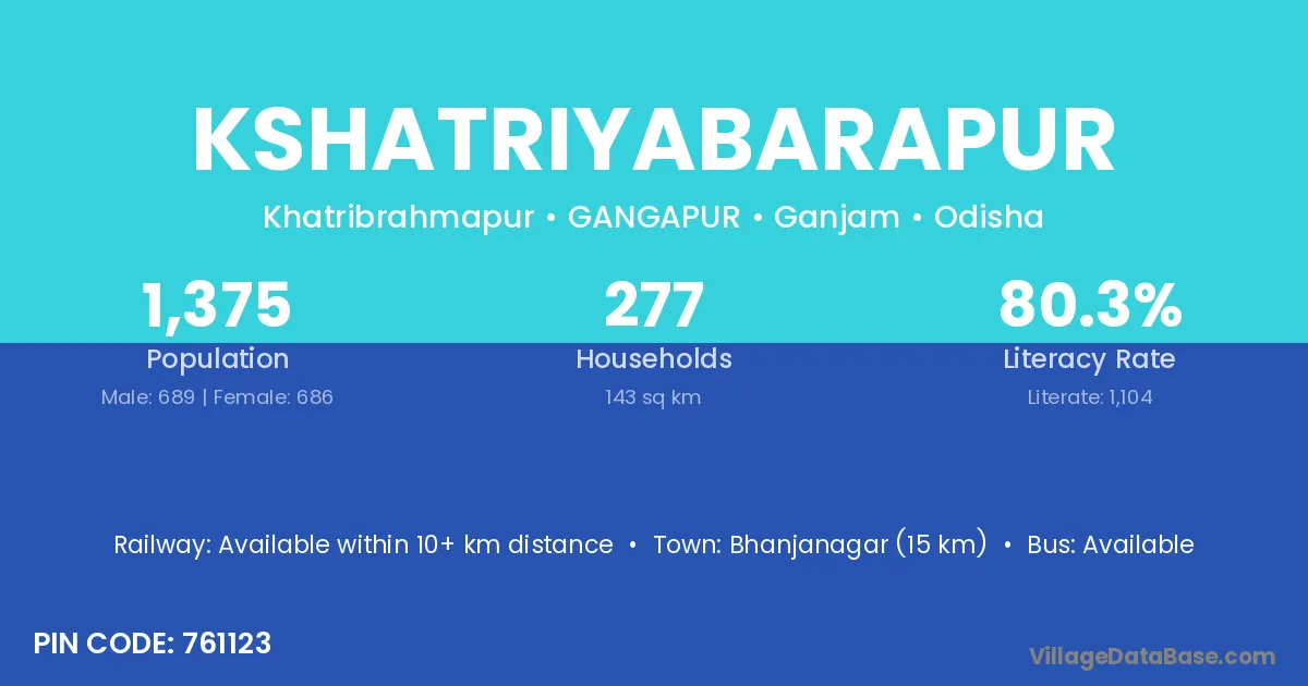 Kshatriyabarapur village has a total population of 1,375 people, of which 689 are males and 686 are females.
