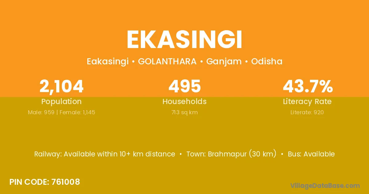 Brahmapur (30 km) is the nearest town to Ekasingi village for major economic activities and is located approximately 30 km away.