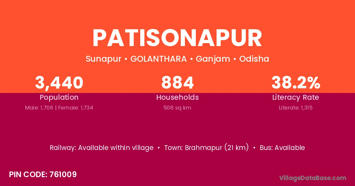 Brahmapur (21 km) is the nearest town to Patisonapur village for major economic activities and is located approximately 21 km away.