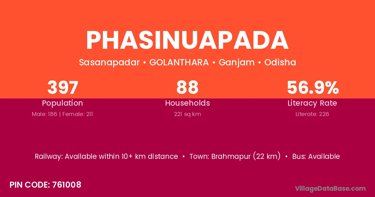 Brahmapur (22 km) is the nearest town to Phasinuapada village for major economic activities and is located approximately 22 km away.