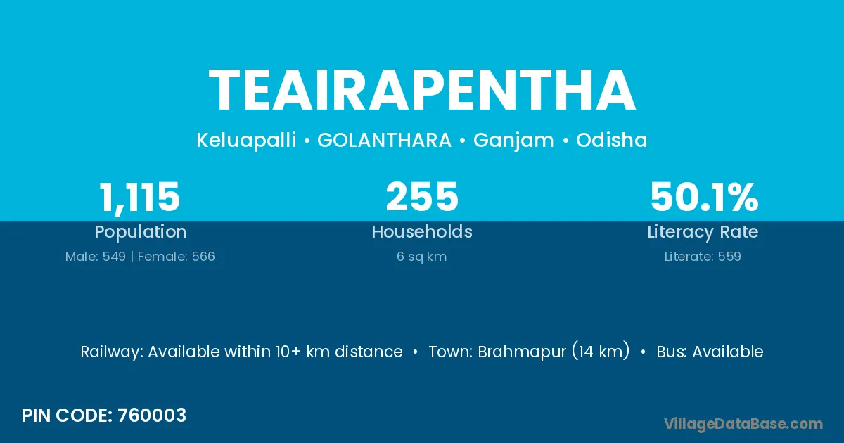Brahmapur (14 km) is the nearest town to Teairapentha village for major economic activities and is located approximately 14 km away.