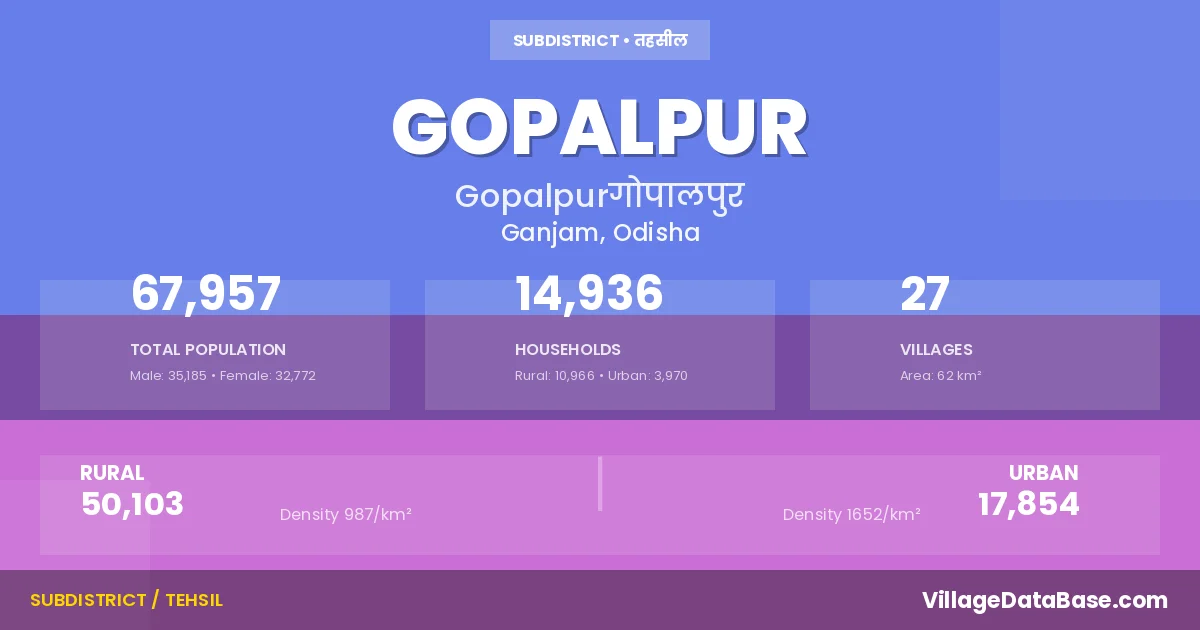 According to the 2011 census The total area of GOPALPUR Tehsil is 62 km², with a population of 67957 people. The population density is 1,103 inhabitants per square kilometre, and there are approximately 14936 houses in the sub district.