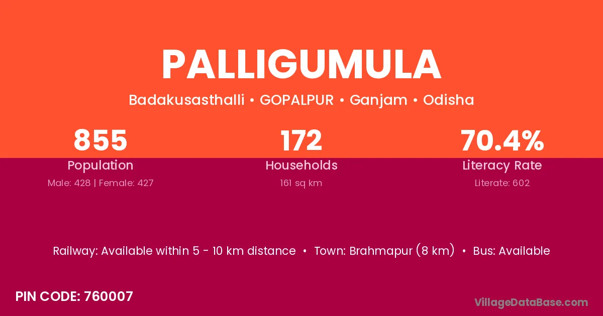 Brahmapur (8 km) is the nearest town to Palligumula village for major economic activities and is located approximately 8 km away.