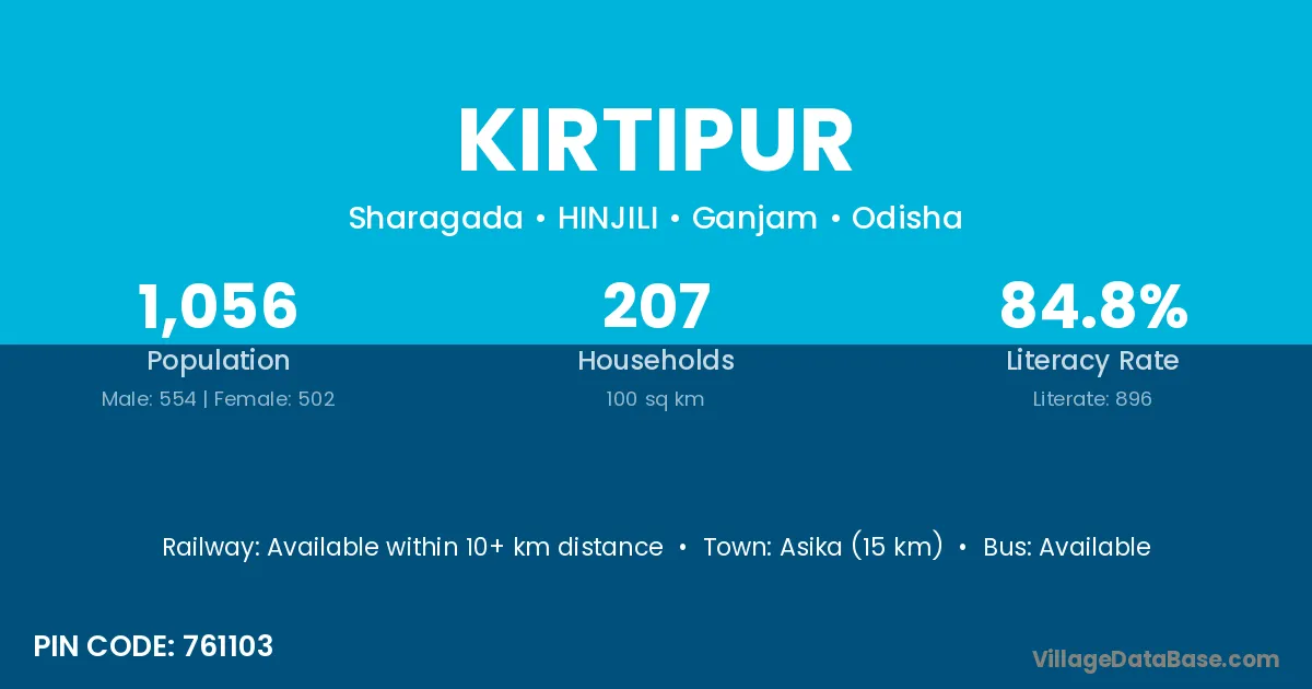 Asika (15 km) is the nearest town to Kirtipur village for major economic activities and is located approximately 15 km away.