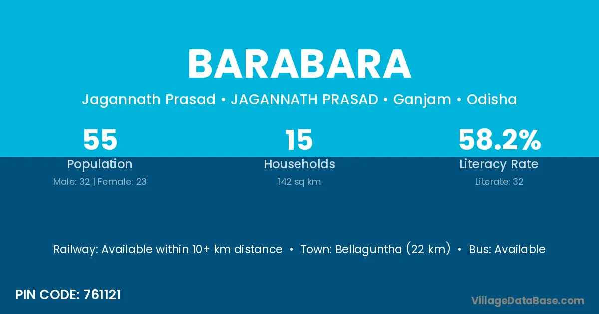 Bellaguntha (22 km) is the nearest town to Barabara village for major economic activities and is located approximately 22 km away.