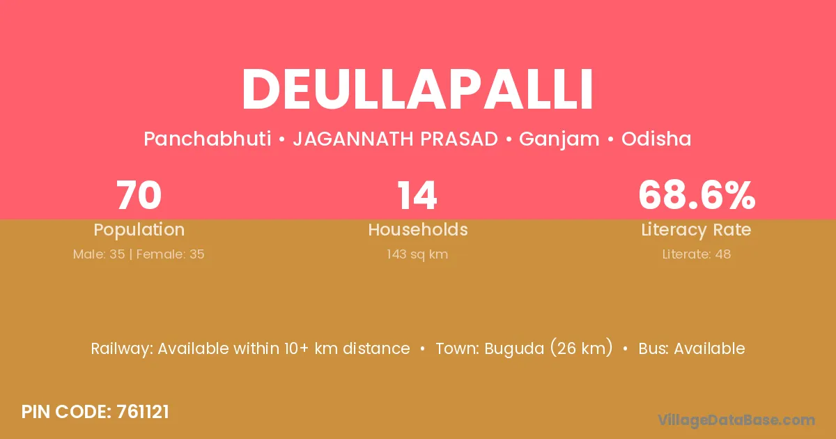 Buguda (26 km) is the nearest town to Deullapalli village for major economic activities and is located approximately 26 km away.