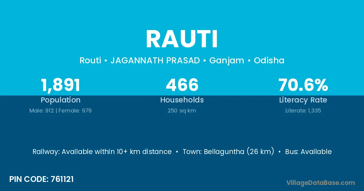Rauti village has a total population of 1,891 people, of which 912 are males and 979 are females.