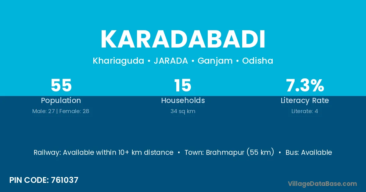 Brahmapur (55 km) is the nearest town to Karadabadi village for major economic activities and is located approximately 55 km away.