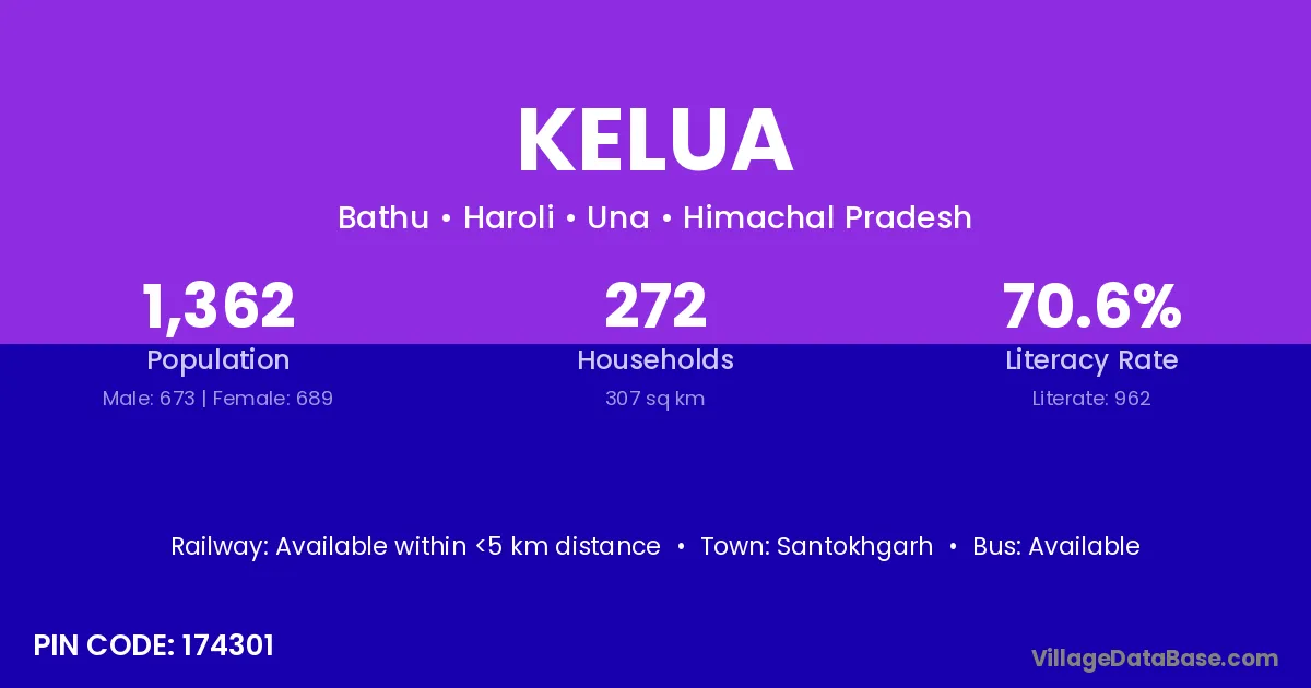 The literacy rate of Kelua village is 59.11%. Male literacy stands at 66.74% and female literacy at 52.04%.