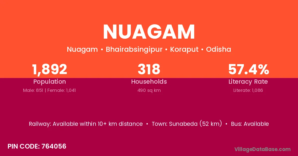 Brahmapur (62 km) is the nearest town to Nuagam village for major economic activities and is located approximately 62 km away.