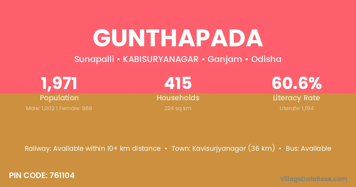 Gunthapada village has a total population of 1,971 people, of which 1,002 are males and 969 are females.