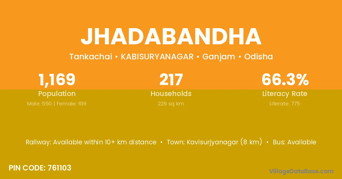 Kavisurjyanagar (8 km) is the nearest town to Jhadabandha village for major economic activities and is located approximately 8 km away.