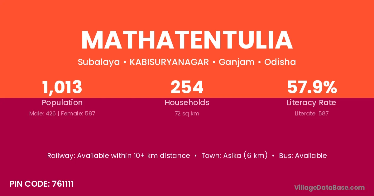 Mathatentulia village has a total population of 1,013 people, of which 426 are males and 587 are females.