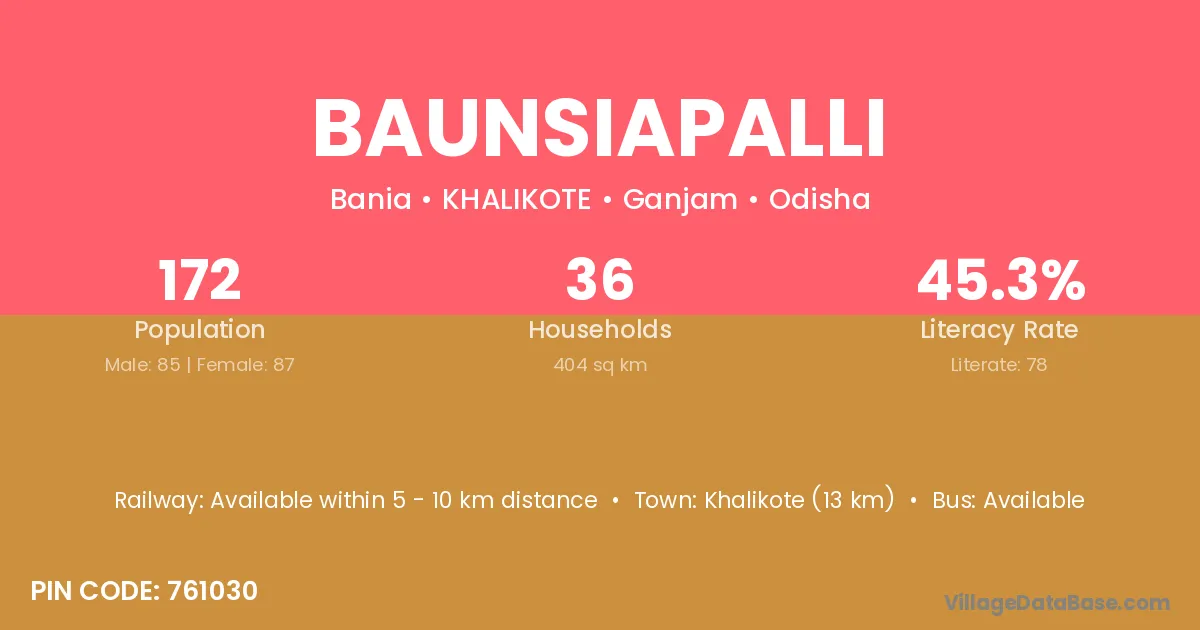 Khalikote (13 km) is the nearest town to Baunsiapalli village for major economic activities and is located approximately 13 km away.