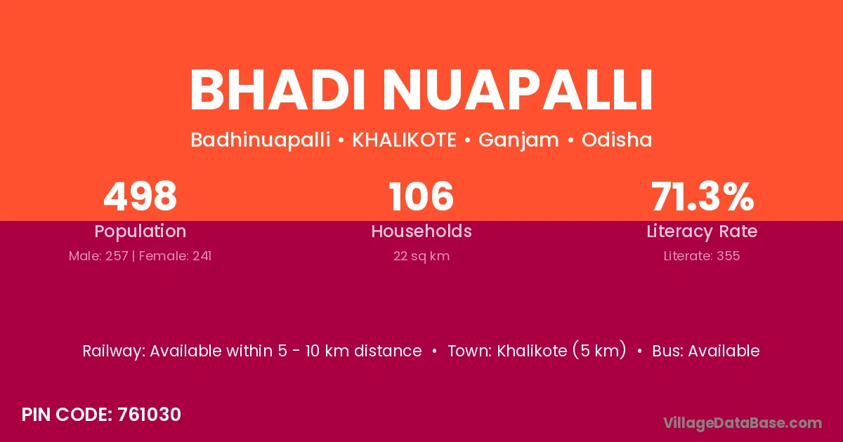 Bhadi Nuapalli village has a total population of 498 people, of which 257 are males and 241 are females.