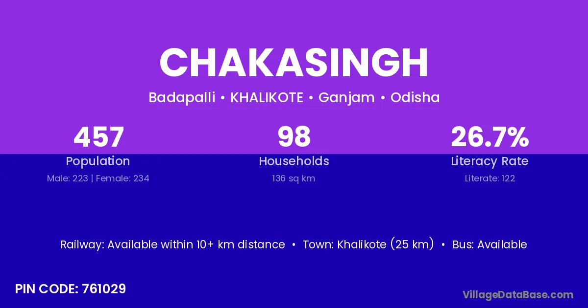 Khalikote (25 km) is the nearest town to Chakasingh village for major economic activities and is located approximately 25 km away.