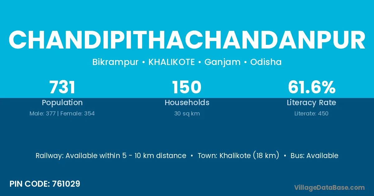 Khalikote (18 km) is the nearest town to Chandipithachandanpur village for major economic activities and is located approximately 18 km away.