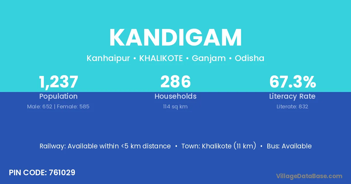 Kandigam village has a total population of 1,237 people, of which 652 are males and 585 are females.