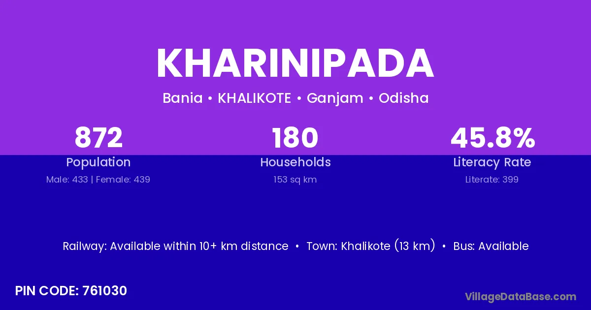 Khalikote (13 km) is the nearest town to Kharinipada village for major economic activities and is located approximately 13 km away.