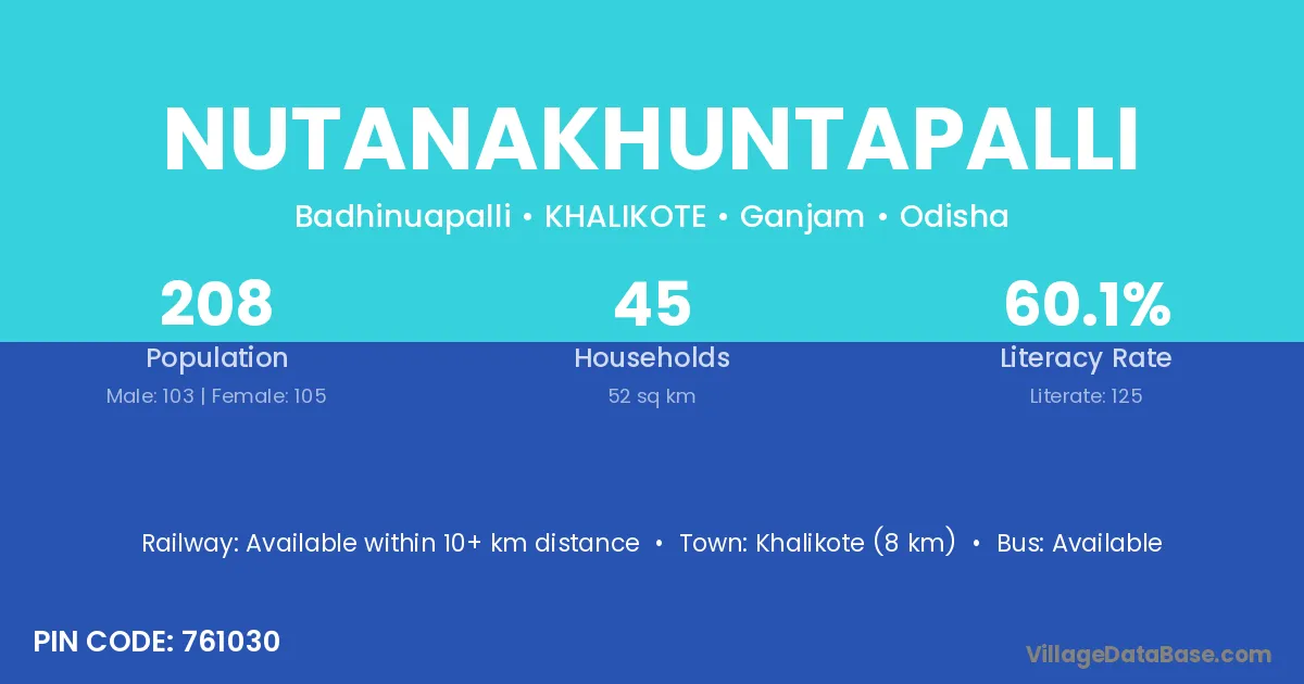 Khalikote (8 km) is the nearest town to Nutanakhuntapalli village for major economic activities and is located approximately 8 km away.