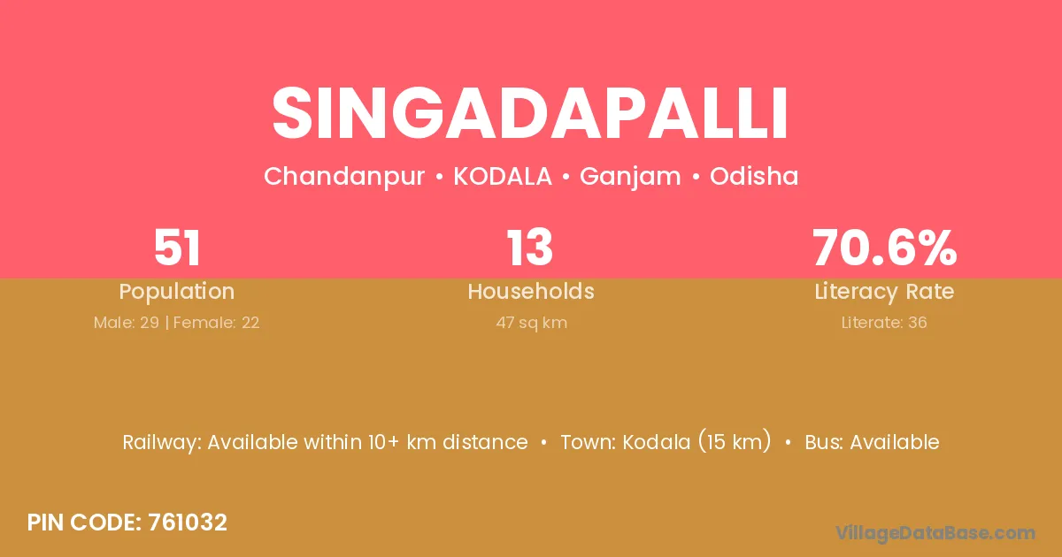Khalikote (10 km) is the nearest town to Singadapalli village for major economic activities and is located approximately 10 km away.