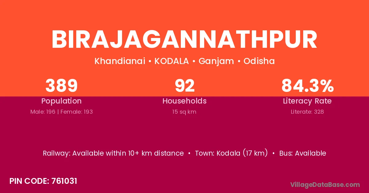 Birajagannathpur village has a total population of 389 people, of which 196 are males and 193 are females.