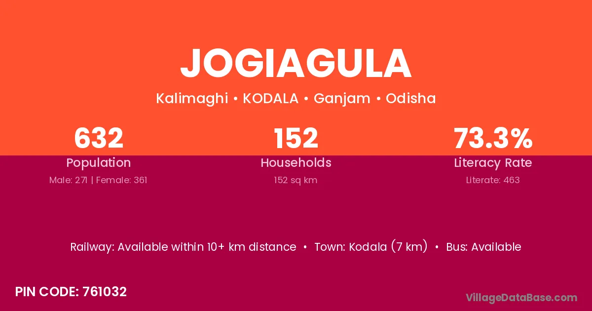 Jogiagula village has a total population of 632 people, of which 271 are males and 361 are females.
