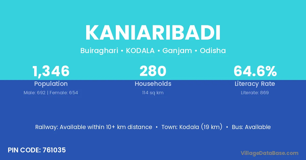 Kaniaribadi village has a total population of 1,346 people, of which 692 are males and 654 are females.