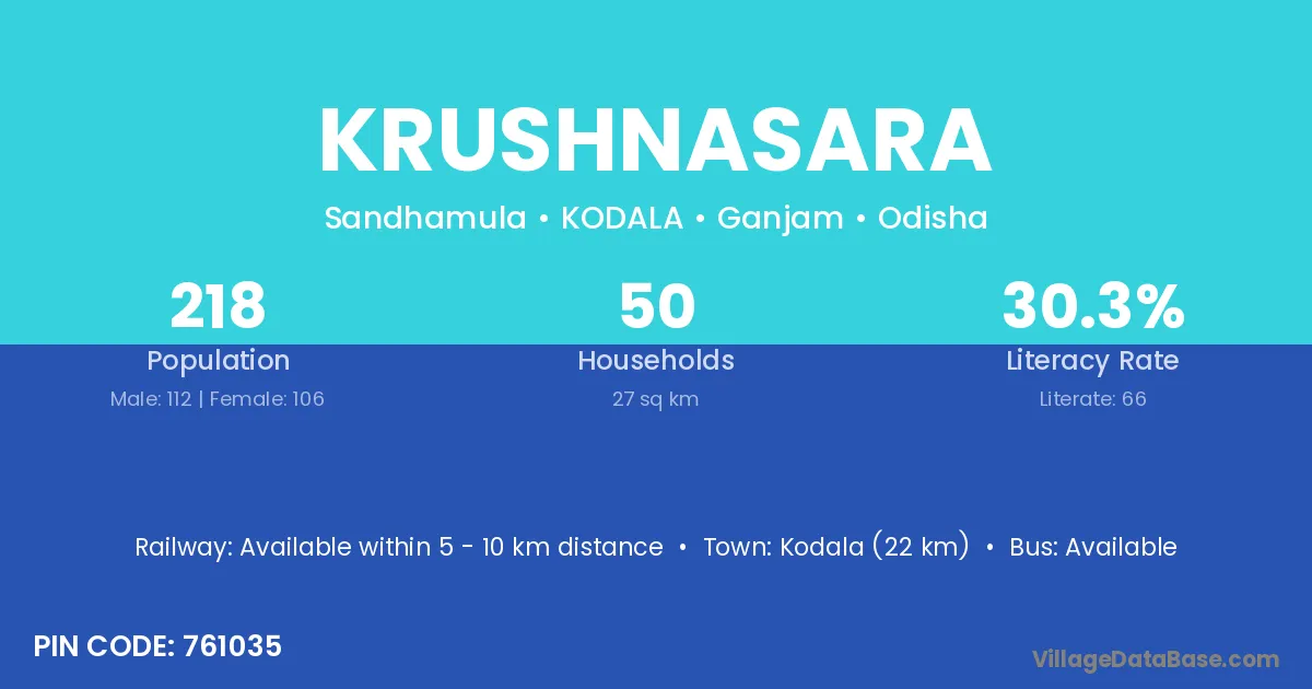 Kodala (22 km) is the nearest town to Krushnasara village for major economic activities and is located approximately 22 km away.
