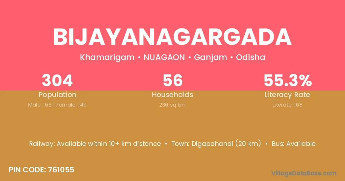 Bijayanagargada village has a total population of 304 people, of which 155 are males and 149 are females.