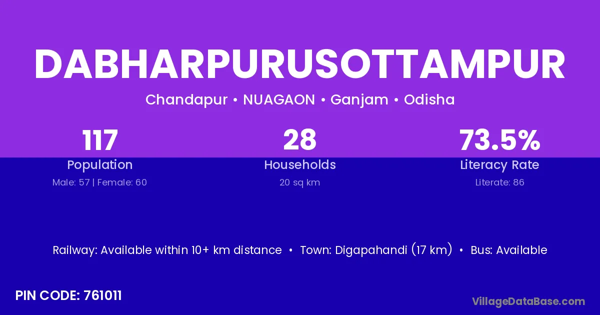Digapahandi (17 km) is the nearest town to Dabharpurusottampur village for major economic activities and is located approximately 17 km away.