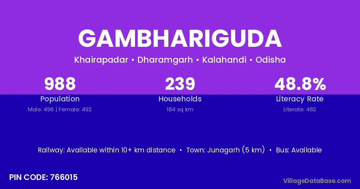 Hinjilicut (13 km) is the nearest town to Gambhariguda village for major economic activities and is located approximately 13 km away.
