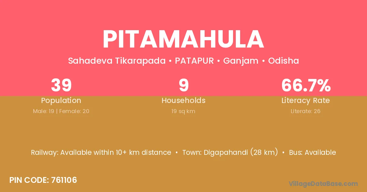 Pitamahula village has a total population of 39 people, of which 19 are males and 20 are females.
