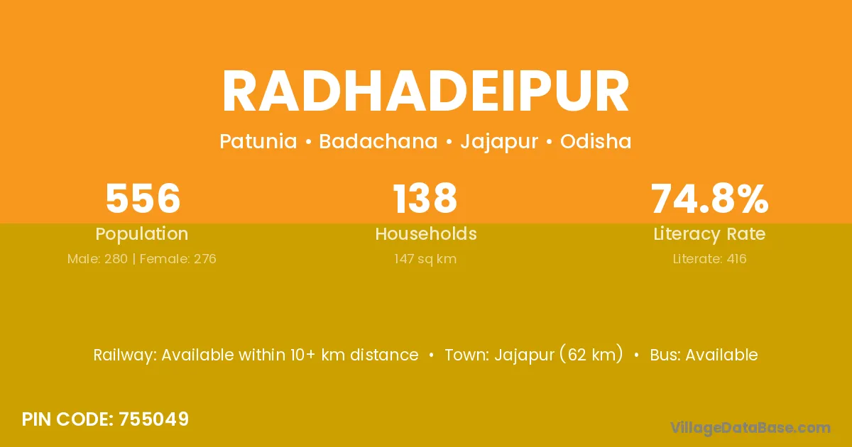 Digapahandi (7 km) is the nearest town to Radhadeipur village for major economic activities and is located approximately 7 km away.