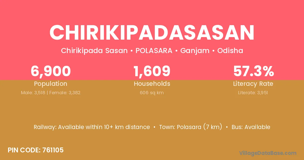 Polasara (7 km) is the nearest town to Chirikipadasasan village for major economic activities and is located approximately 7 km away.