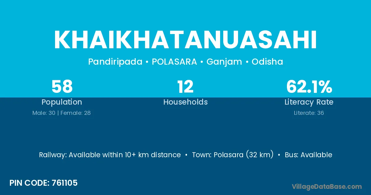 Polasara (32 km) is the nearest town to Khaikhatanuasahi village for major economic activities and is located approximately 32 km away.