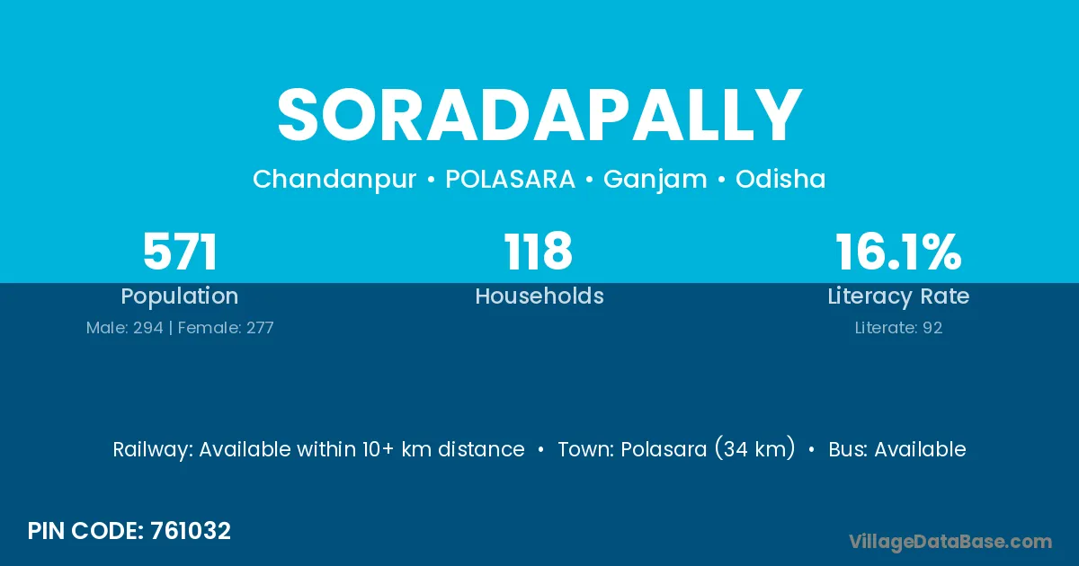 Polasara (34 km) is the nearest town to Soradapally village for major economic activities and is located approximately 34 km away.