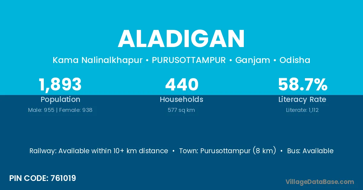 Purusottampur (8 km) is the nearest town to Aladigan village for major economic activities and is located approximately 8 km away.